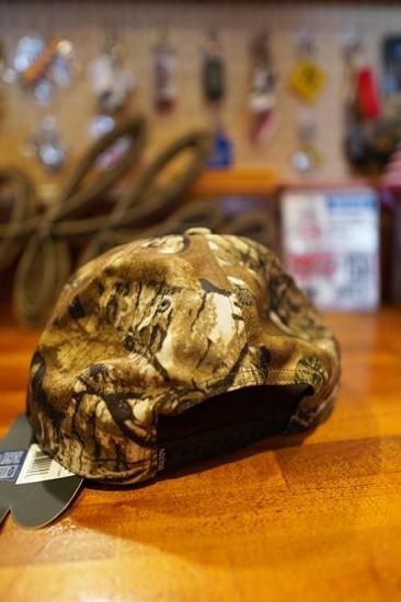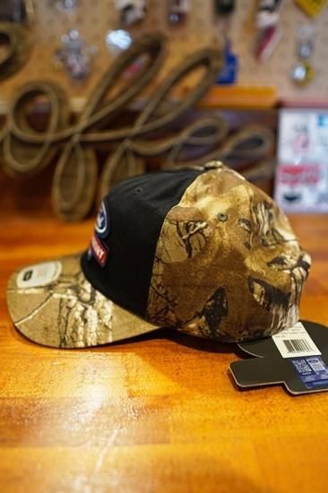 コラボレーションアイテムならではのロゴやアートワークの刺繍パッチをセットしたカモ柄素材のスナップバックキャップ。